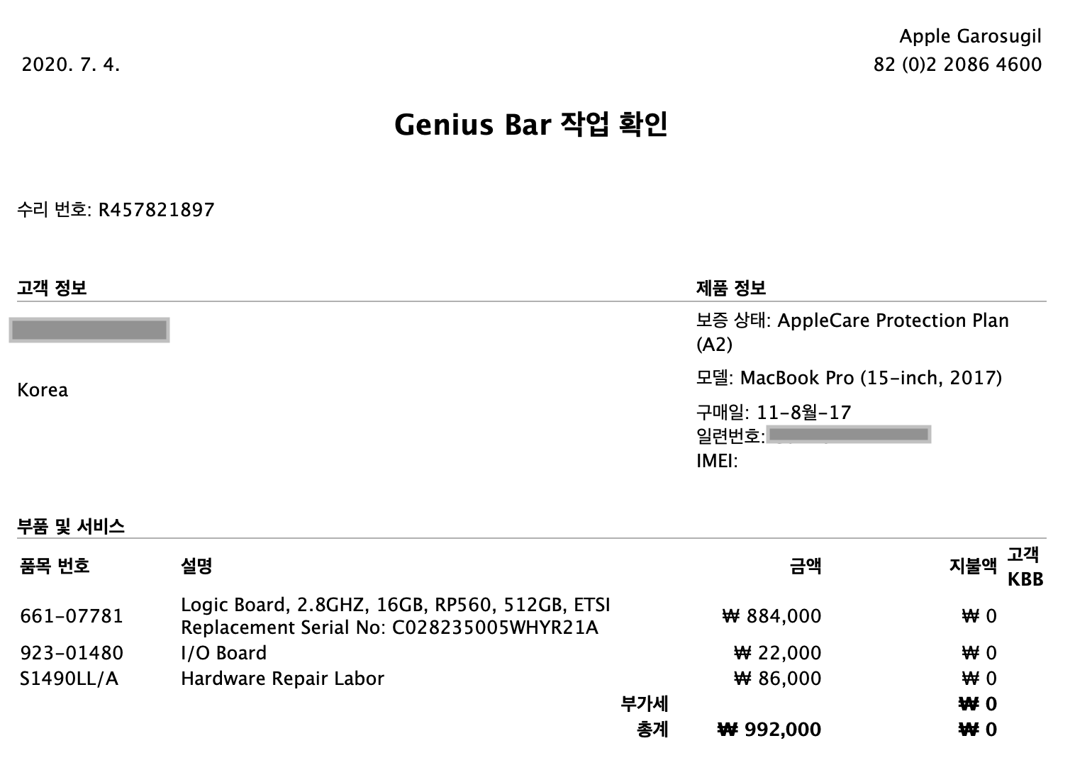 이렇게 해서 총 비용은 230여만원이었고 애플케어 적용으로 전액 무료처리됐다. 그냥 하판 덮개를 제외한 모든 게 교체됐다. 사람 몸이 몇년에 한 번 사이클로 모든 세포를 교체한다고 하더니 딱 그런 케이스인 것 같다.